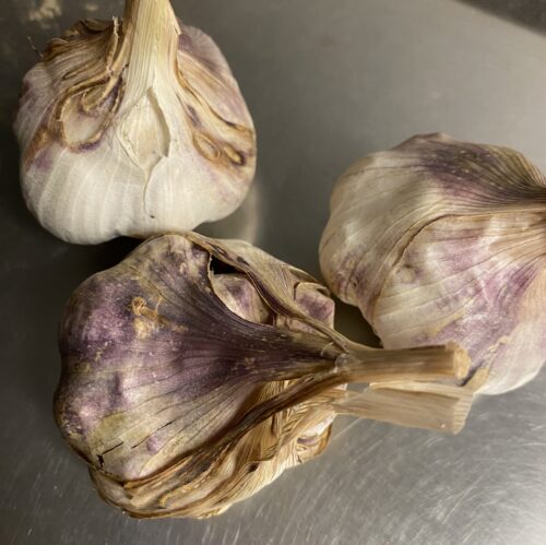 California Early – Artichoke softneck variety. The probable origin of California Early is Gilroy, California by John Swenson. The bulbs are very symmetrical with silky smooth skin and a faint pink pinstripe, making them very attractive in garlic braids. California Early is more tolerant of hotter climates than Susanville. The bulbs have nice sized cloves on the outside and smaller inner cloves. The taste is a mild but very pleasing; makes a nice addition to breakfast burritos!